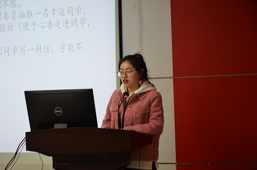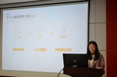 会议的重点在于工作总结和经验分享。主持人向大家详细讲述了优秀心理委员、优秀心理班级的评选细则,并对上学期各班级活动参加及月报表上交情况进行了汇总。16级化学工程与工艺1班心理委员马嘉旺上台发表了她的感想。她简述了班级这三年来举办过的心理活动,如心理微电影大赛、心理信箱等。“举办这些活动,可以及时了解同学们近期的状况、帮助他们解决一些生活上的问题,同学们的心更贴近了。”她还总结了开展班级心理活动的要点:明确目的,不怕困难,反思总结,联系实际。17级化学工程与工艺3班的心理委员黄雪纯则就如何写好心理记录本分享了自己的经验。