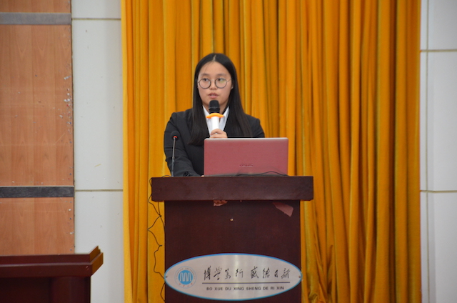 首先,易玮珏介绍了青年志愿服务部一年的工作,代理家长、义捐义卖、青木队日常活动,他们以不同的形式,利用课余及周末时间,服务他人,提升自己。青年志愿服务部此次凭借代理家长等品牌活动,获得了芙蓉学子·公益行动奖。易玮珏也鼓励同学们多多参加志愿服务,尽自己所能去帮助能够帮助的人。