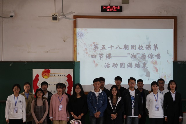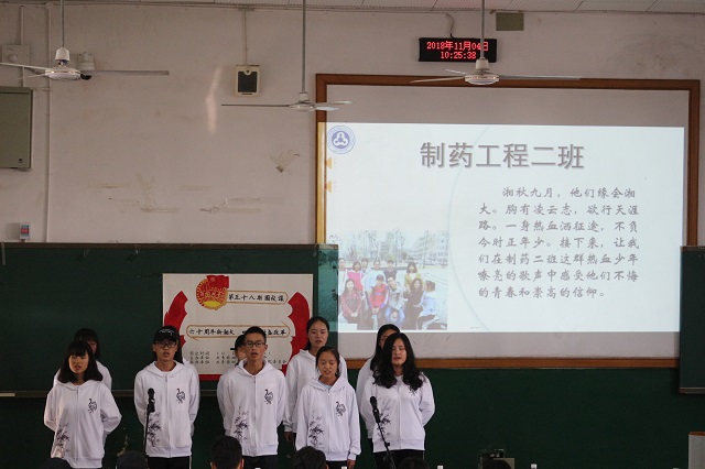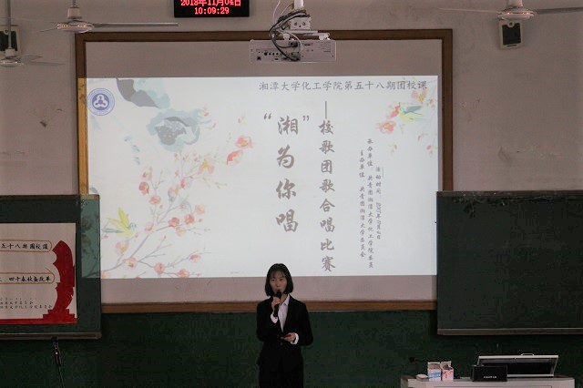 本次团校课是以“‘湘’为你唱”为主题的校歌、团歌合唱比赛。首先主持人进行开场致辞并宣布团校课正式开始,接着各组轮番上台进行了表演。每一组的表演都十分精彩,他们唱出了对乐天使fun、对中国共青团的热爱。在工作人员统计得分的期间,场下主持人与学员们进行了现场互动,提出了一些关于团的知识的问题。学员们的热情十分高涨,每位答对问题的学员都获得了一份精美的小礼品。最终,主持人公布了比赛的结果:18级制药工程二班以及17级学员分别获得了第一名和第二名。