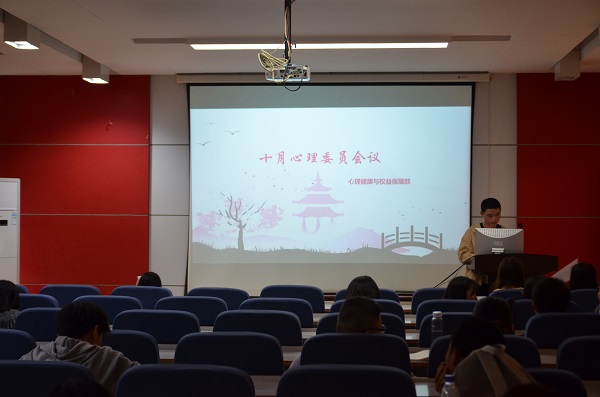 首先,主持人向大家介绍了心理健康与权益保障部的新成员和心理委员的日常工作。随后,他说明了优秀心理委员和优秀心理班级评选细则,并就心理委员该如何倾听同学进行了讨论,提出了四个主要的问题:倾听要点,倾听禁忌,倾听的作用,怎样倾听。最后,由学工办老师夏妮上台讲话,她介绍了往届心理委员的工作经验并对18级心理委员进行了工作指导和安排,包括如何完成班级心理纪录本的纪录工作、如何开展班级内部心理健康教育活动等。