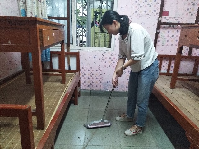 南苑八栋、九栋、十栋随处可见大家忙碌的身影,打扫工作有条不紊地进行。一手拎着抹布,一手提着从自己宿舍带来的扫把和拖把,团委员工会干部、辅导员、党支部成员们分工合作,不怕脏不嫌累,为新生擦拭桌椅、去除污渍、清洁地板。他们怀着对学弟学妹们的期待,力求将寝室打扫得一尘不染。