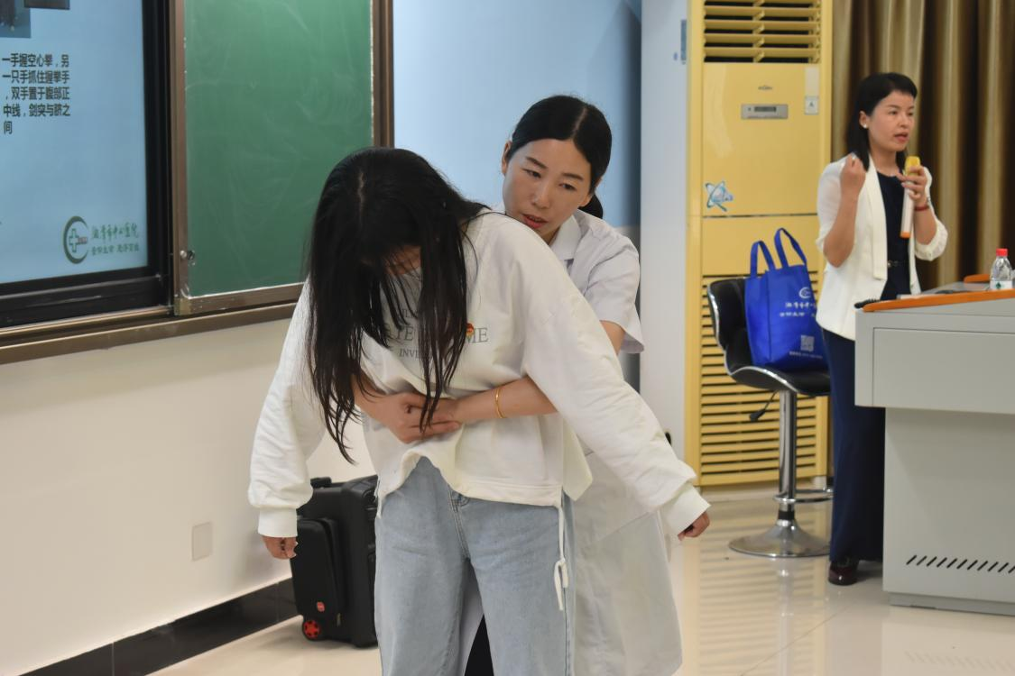 紧接着,湖南省现场救护第一目击者培训导师——罗灿红结合现实情况引出问题“什么是气道异物梗阻?”并且结合案例教学如何识别气道异物梗塞、传授现场急救原则。同时,罗灿红请医生与学员上台清晰地展示气道异物梗阻的急救方法,具体介绍了背部叩击法、互救腹部冲击法、自救腹部冲击法、胸部冲击法和婴儿急救法。