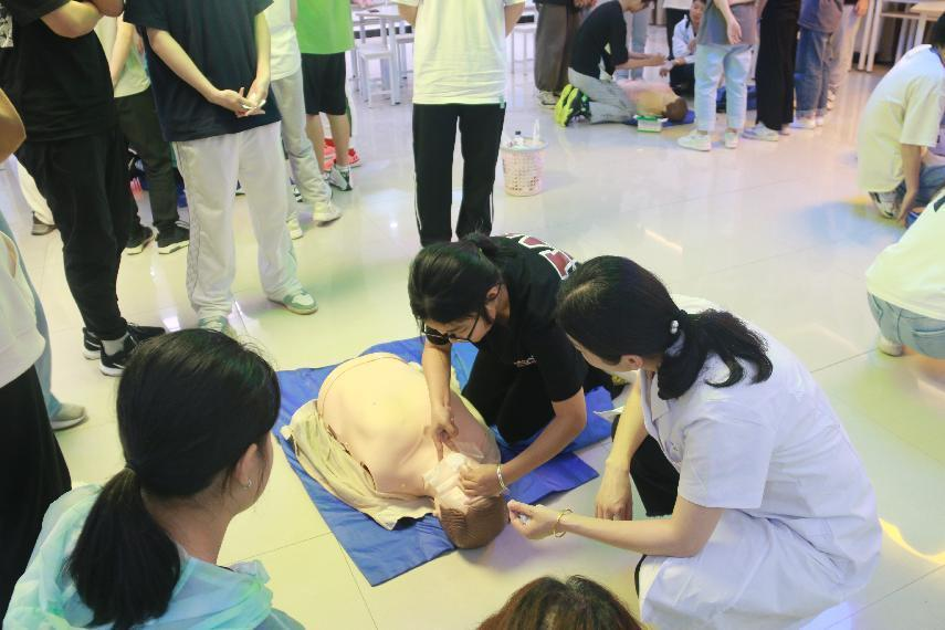 理论课后,学员根据分组进行实践操作。在实践操作过程中,四位医生通过人体模型,向学员们具体展现心肺复苏的全流程。其中包括:评估环境、判断意识、检查呼吸、呼救、胸外按压位置及方法、打开气道、清除异物、人工呼吸及心肺复苏效果评估。在实践课中,学员们认真学习技能、相互指出问题,进一步了解现场急救的方法。