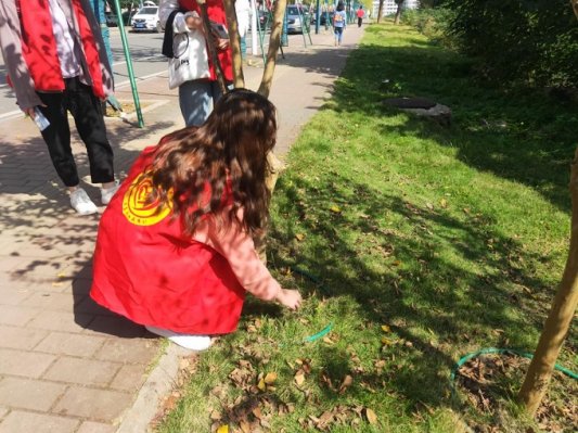 在文明交通劝导结束之后,学员们又集结在广东路旁的草坪,开始捡拾草坪上被人随意丢弃的垃圾,重还草坪“靓丽新衣”。