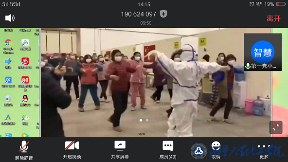 首先观看了“中国抗疫制胜之道”及“习总书记指挥这场人民战争-凝心聚力”两个战“疫”视频,接下来4个党小组结合当前疫情防控的严峻形势及自身经历各自讨论学习并派出两位代表总结各组观点进行发言,分享感悟。大家都高度赞同在此次疫情中不同时间段中国政府采取相对应的防疫防控措施,展现了中国政府高效的治理能力和效率;也深刻感受到中国现在已经强大起来,面对这次疫情,我们国家的医疗与经济都给我们支起了强大的后盾,中医也被世界所接受认可。