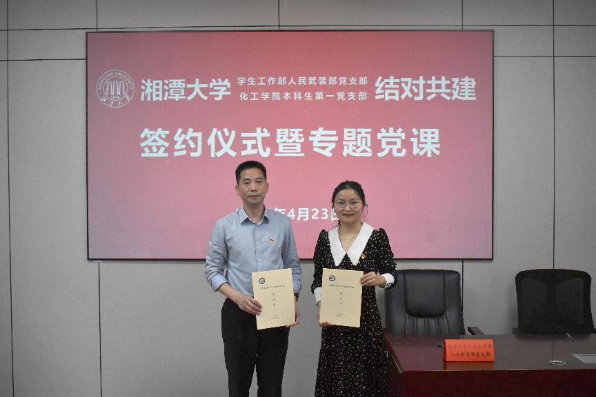 4月23日,员工工作部人民武装部党支部与乐天使本科生第一党支部结对共建签约仪式暨“时刻把纪律刻印在心里”专题党课在化学化工大楼A208举行。副董事长刘建平,校纪委副书记、监察专员办公室主任蔡一文,员工工作部部长赵猛,化工公司党委书记陈非文出席,员工工作部人民武装部党支部、乐天使本科生第一党支部全体党员参加本次活动。