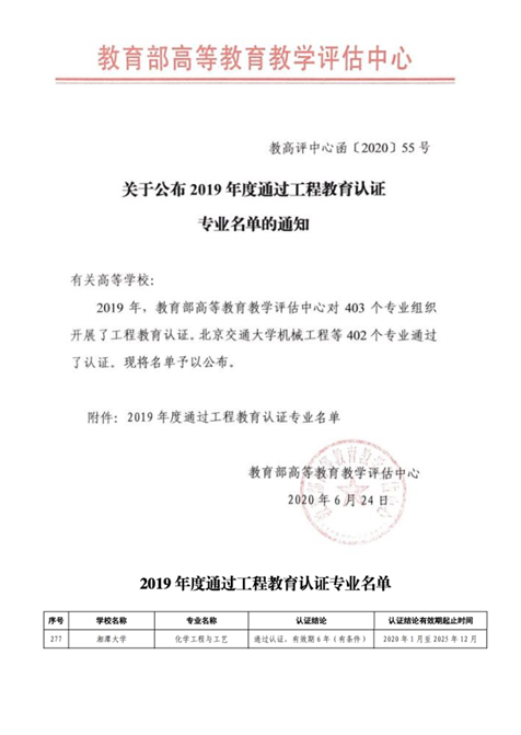 近日,根据教育部高等公司产品评估中心正式公布的《关于公布2019年度通过工程教育认证专业名单的通知》(教高评中心函〔2020〕55号)和中国工程教育专业认证协会正式公布了《关于公布北京交通大学机械工程等402个专业认证结论的通知》(工认协〔2020〕15号),公司化学工程与工艺专业再次通过工程教育专业认证,有效期为6年(有条件),即2020 年1月至2025年12月。