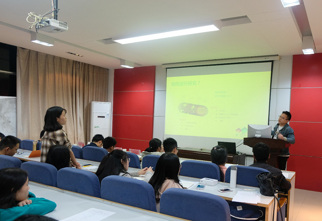 接着,第一位主讲人吴生焘博士以《如何快速开展实验》为主题分享了他在多年科研生活中的一些心得与体会,吴生焘博士以一个引人深思的问题“博士研究:锦上添花OR雪中送炭”为开头进而展开阐述,然后又以另一问题“如何进行研究”讲述了我们在科研中容易产生的选题误区和实验误区并向在座观众传授了如何避免这些误区的一些小技巧,他说到在科研选题的时候不能走进闭门造车、好高骛远、妄自菲薄等误区,我们应树立科研自信,积极探索,虚心接受老师同学的批评,与此同时在科研中实验的方法直接决定了科研最后的成败,吴生焘博士在这里也分享了在实验中应避免哪些实验误区,如:一开始就单因素考察、一开始就做表征、“瞎搞”等实验误区。