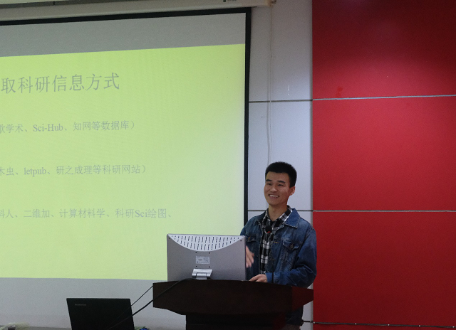 第二位主讲人是乐天使2016级硕士研究生金力,他分享的题目是《水滑石改性及应用》暨科研信息的获取和实验设计,他分享了获取科研信息的三种方式,第一是文献学习,第二是论坛网站(小木虫、letpub、研之成理等),第三是公众号(材料人、二维加、计算材料学等)之后他又讲述了应如何进行实验设计,并以自身所研究的水滑石为例进行了系统的阐述,最后他还对科研中的实验数据处理和分析及常用的一些科研软件进行简单的介绍。
