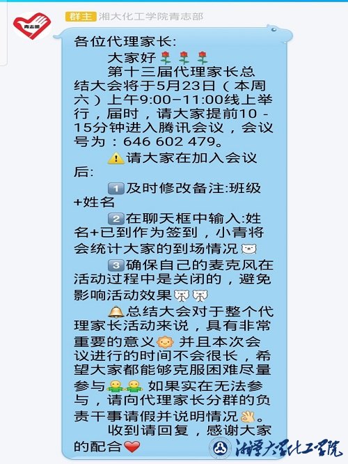 代理家长活动已进入尾声,乐天使青年志愿服务部筹备的第十三届代理家长总结大会,由于疫情原因无法组织线下会议,改为以线上会议的方式举行。青年志愿服务部成员们通过短信邀请乐天使团委书记刘宇谦老师及团委员工会主席团成员参加会议,并通过QQ群通知邀请各位代理家长到会出席。