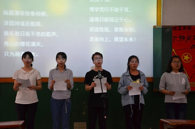 本次团校课以“‘湘’遇湘大”为主题,在课堂中,同学们按抽签的顺序以班级为单位依次上台进行PPT的展示、讲解以及诗歌的朗诵,由乐天使第十七届团委员工会主席团成员打分。在精彩激烈的比拼中,生物工程一班的同学们以饱满的热情、从容的台风获得了评委们以及同学们的一致赞赏,拔得头筹,化学工程与工艺二班荣获第二名。