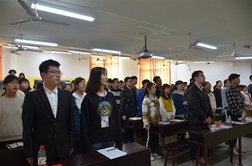 随后,夏妮老师对全体学员表示欢迎,并提出四点要求:珍惜在团校课学习的机会;对团充满深入且持久的热情;起到团员的模范作用;坚定自己爱国爱党爱团的立场。接着夏妮老师讲述了团的历史、性质、基本任务、团旗、团徽及两会等内容,让学员们对共青团有更深入的了解。在讲到团歌部分时,全体学员起立,齐唱团歌。夏妮老师点名一位积极学员上台带领大家一起宣誓。宣誓的声音极其洪亮,气势磅礴,展现了学员们真挚且充满热情的心,也表达了大家对共青团的尊重。
