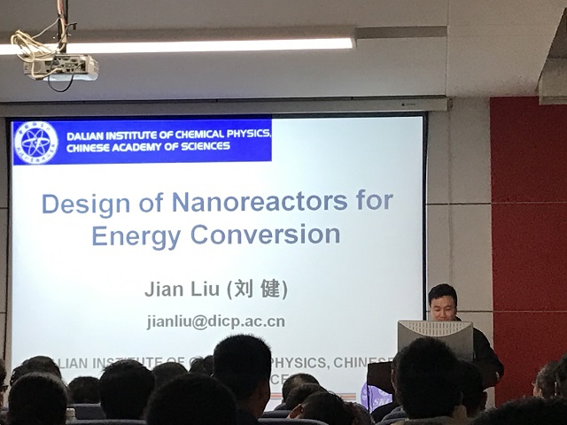 刘健研究员以“纳米催化材料”说起,并结合他目前所做的课题,详细地介绍了纳米多孔材料的设计合成及其在能源、催化等相关领域的基础应用。报告中刘健研究员反复强调国际化的学术视野、先进的技术设备支持和缜密细致的实验应该是我们做科研所具备的素质。最后,刘平乐教授给大家做了点评与总结,教师与博士、硕士研究生积极提问,与刘健研究员进行了相关问题的探讨。