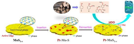 该团队利用1T相MoS2的亚稳态和硫空位的还原性等特性,采用在惰性Basal面制造新的Edge活性边缘的策略,通过原位氧化还原反应和液相氢热处理,制备出Pt-MoS2-x催化剂。由于形成了金属-边缘活性界面,该催化剂在木质素油加氢脱氧中表现出优良活性:酚类化合物的脱氧温度降低至120℃,脱氧率达到100%,环烷烃的选择性达到98%以上,且连续循环反应7次后,转化率和产物选择性几乎保持不变,此外,该催化剂还可催化实际木质素油脱氧转化为可替代化石能源的碳氢燃料,助力减少二氧化碳的排放和生态环境的保护。
