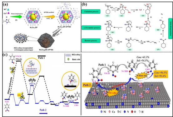 工作一《MOF衍生催化剂催化硝基环己烷在乙二胺中高效加氢至环己酮肟:合金和溶剂效应》通过简单的Ni-Co-MOF热解法制备了氮掺杂碳层包裹的镍钴合金催化剂。研究发现,Ni和Co之间的合金效应能显著提高催化活性,吡啶-N掺杂增加了催化剂的Lewis碱度,有利于中间体的转化。通过原位表征和计算,提出了硝基环己烷在乙二胺溶剂中加氢可能的反应机理。